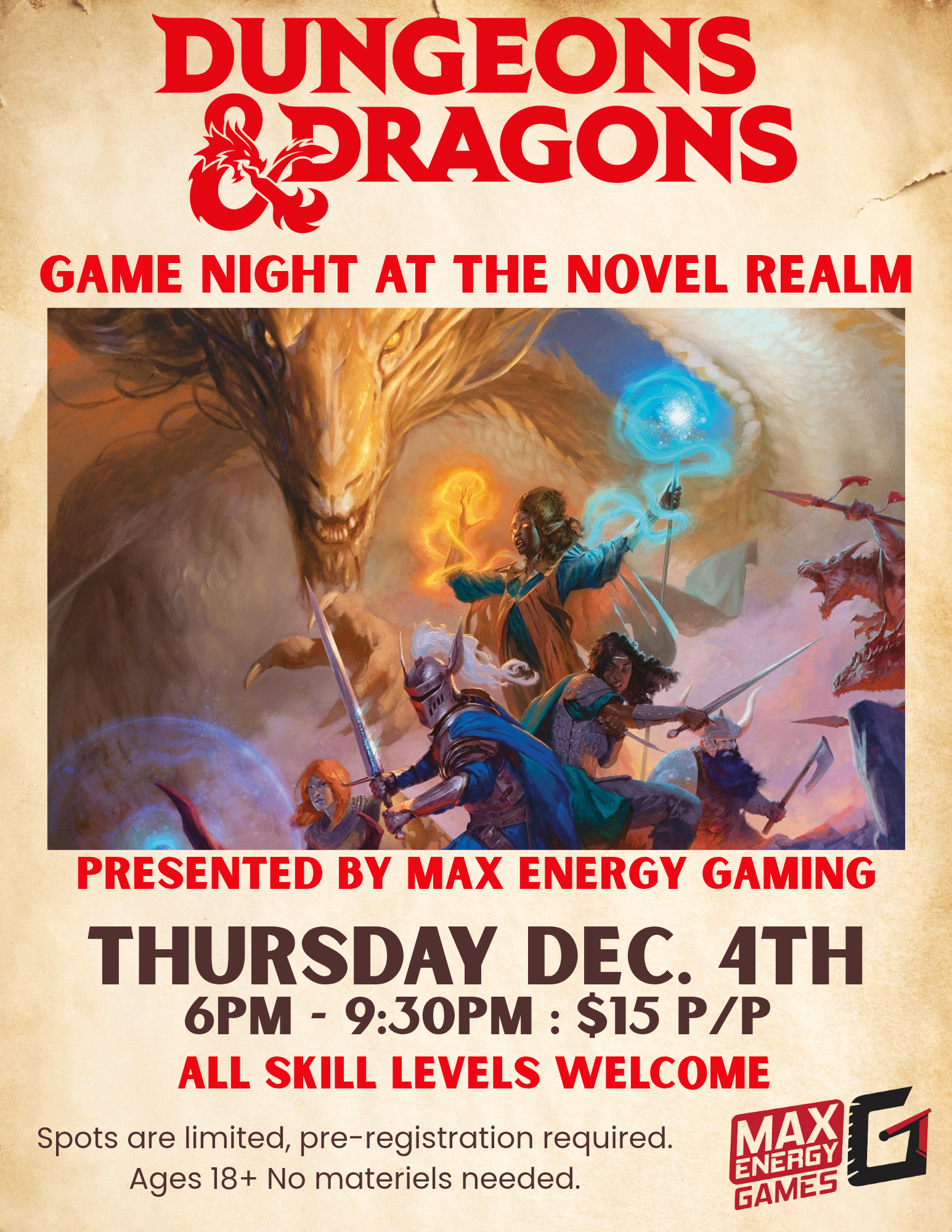 The Novel Realm offers a wide variety of events. A few things we host-Magic the Gathering events, craft & sips, open play games, RPGs, bookclub, birthday parties, bingo nights, trivia, and more!