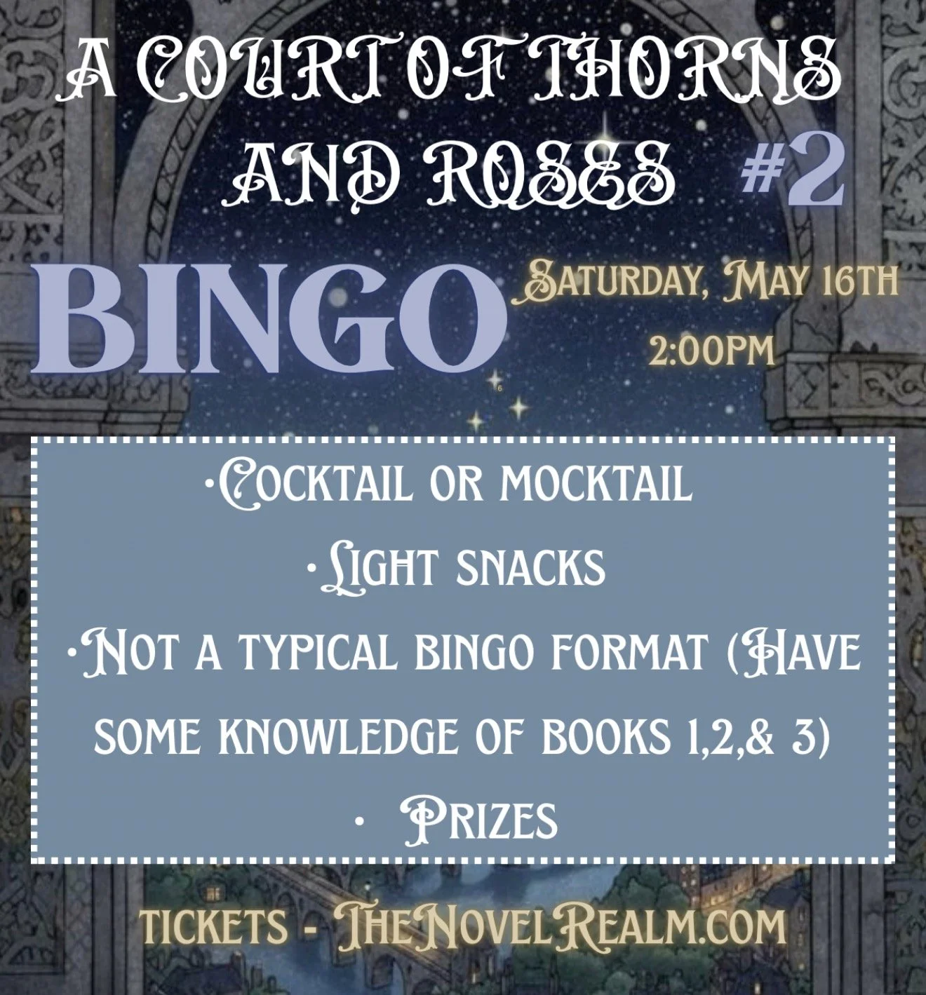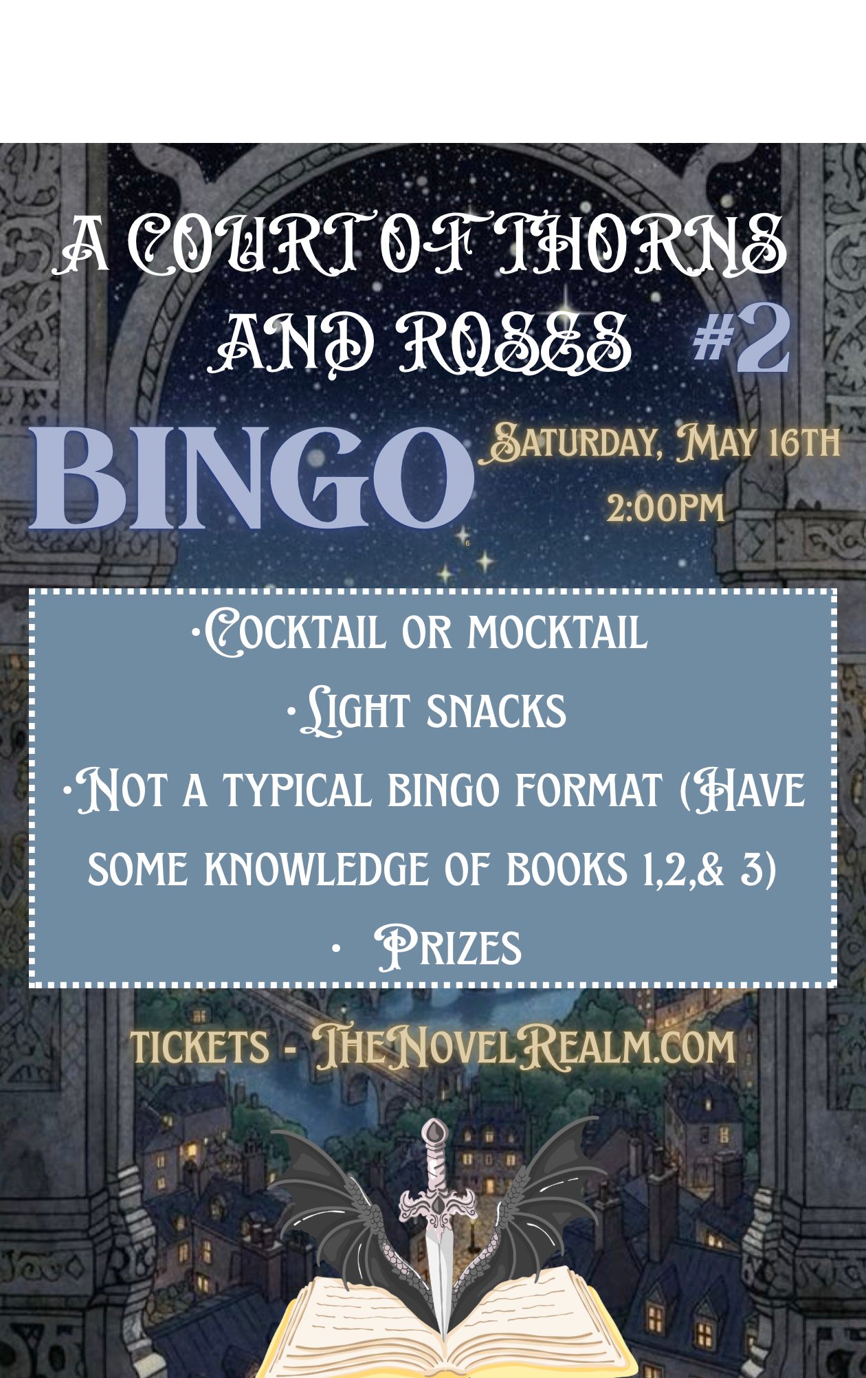 Enjoy a signature a cocktail or mocktail. Or BYOB. Light snacks will be available. Not all rounds are a typical format. You should have some knowledge of the first three books of the series just in case!